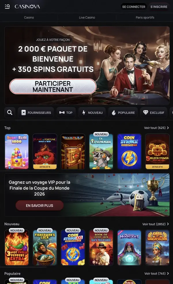 - Navigation centrée utilisateur : les filtres par catégorie et fournisseur vous aident à retrouver vite vos jeux récents, y compris les favoris Casinova que vous ajoutez à votre liste.